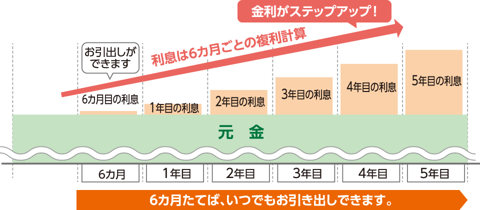 6カ月据置後は、お預入期間を決めずにお預入れいただき、お引出しの時点を満期とする定期預金です(最長5年)。
