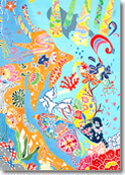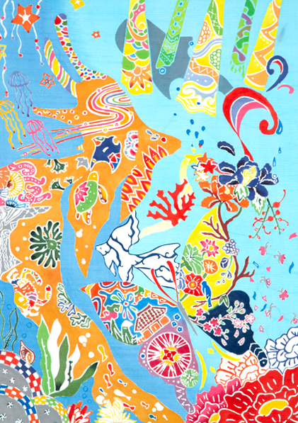 奨励賞の1点目は「楽園~沖縄の宝~」は島尻稚菜さんの作品。作者は第26回にも奨励賞を受賞した実力者である。今回の作品は沖縄の自然美やその魅力を空や海、チョウや魚など色鮮やかに流動的な表現は巧みである。構成力、色彩感覚、技術力いずれも秀逸である。