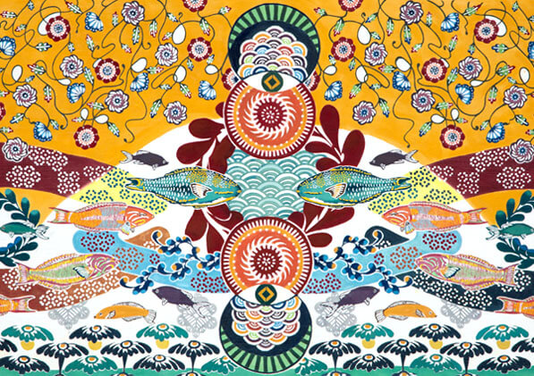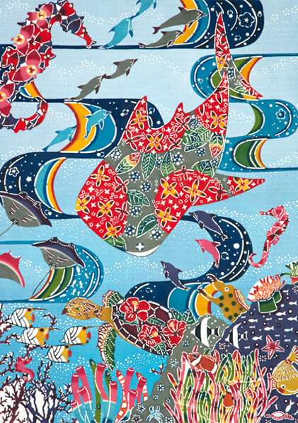 私の記憶によると、戦後紅型復興に功績のあった城間栄喜氏が初めて魚をモチーフに紅型を染めたのが最初かと思う。その場合でも海中を泳ぐ魚ではなく、魚そのものの図柄である。そこで思い浮かぶのは本部町の海洋博記念公園の「沖縄美ら海水族館」などの影響が多少あるのではなかろうか。現代紅型の海をテーマにしたデザインは定評があり、伝統工芸にも変革があることが理解されよう。
