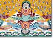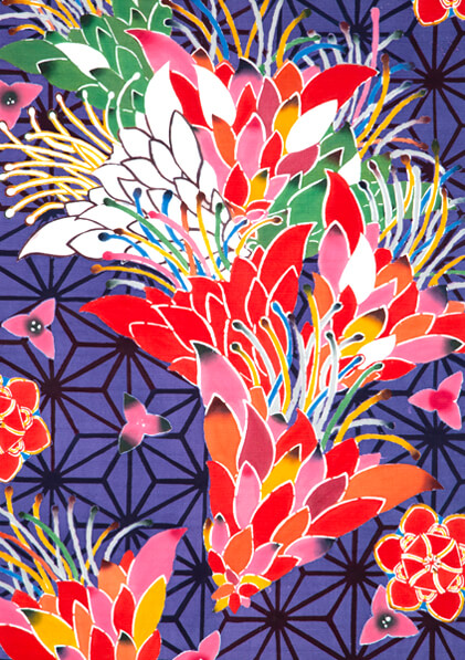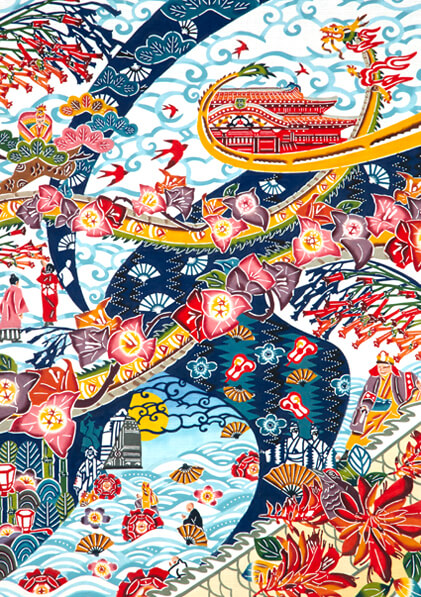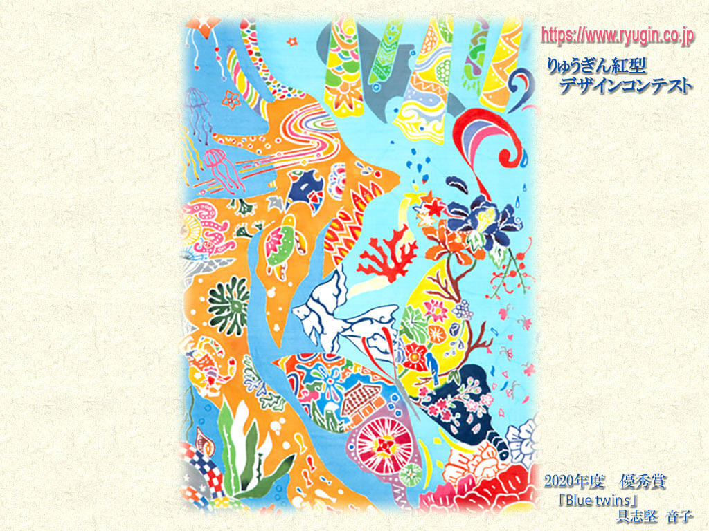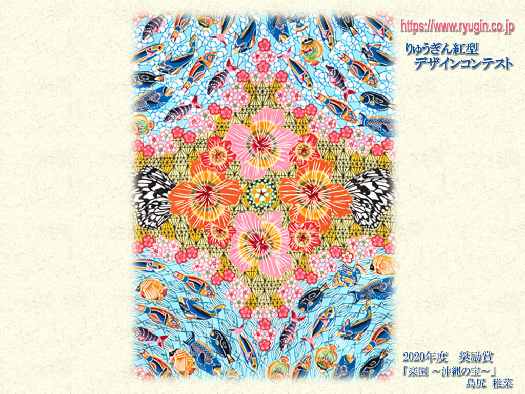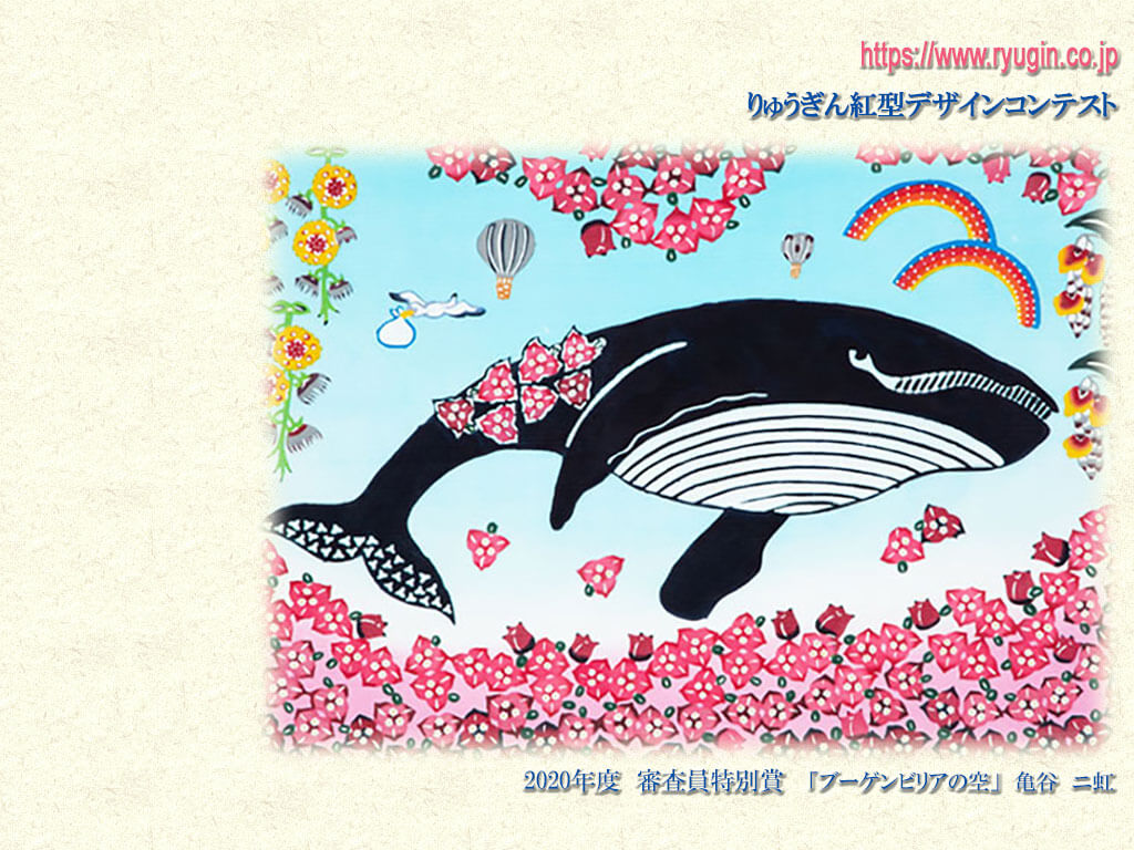 審査員特別賞「ブーゲンビリアの空」は亀谷二虹さんの作品。画面中央に大きなクジラを印象的に描き、その後方に幸せを運ぶコウノトリが小さく描かれている。周辺をブーゲンビリアの花で飾り、月桃の花や虹、サガリバナなどアクセント効果もある。若い作者の優しさと爽やかさが満ち溢れた作品である。講評のおわりに追記しておきたいことがある。現在、本コンテストの応募作品には圧倒的に沖縄の海をテーマにした作品が多い。またそれを一般人にも違和感なく受け入れられているのも事実である。そこで昔の古典紅型を振り返って感じたことは意外に海や魚類の図柄は見当たらない。つまり古典柄は牡丹、鳳凰、瑞雲、流水、松竹梅等々である。