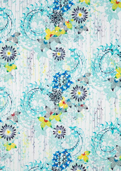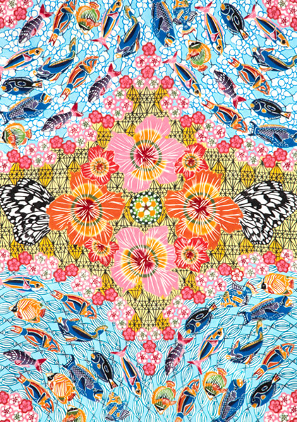 青く広い海を泳ぐ魚、草花や文化にはどれも太陽に映える色鮮やかさで、沖縄で生活できたことで心から明るく華やかにしてもらえたと感じています。この心の中にある色と華やかな世界を濃縮して身体に吸収し放出していく感覚を表現したいという願いを今回叶えさせていただきました。