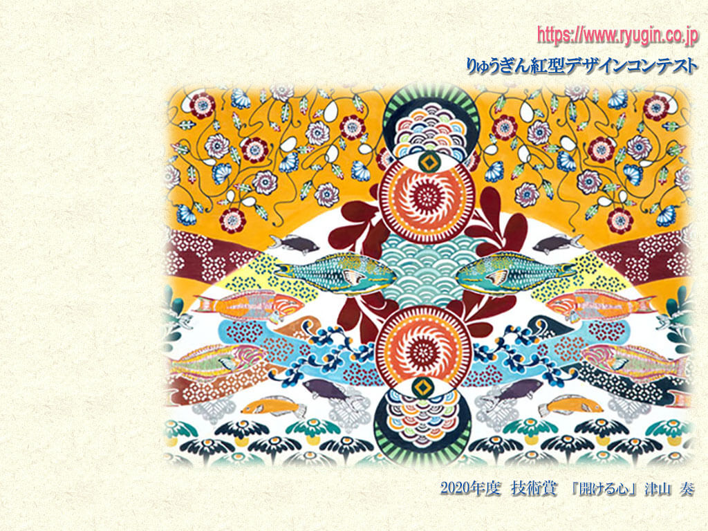 デザイン賞「ヒヤミカチ」は吉濱愛さんの作品。作者はこの作品にいかなる困難にも挫けず伝統文化を継承する沖縄人のたくましさを表現したとする。世界に冠たる琉球王朝文化の独自性、豊かさが永久に継承されることを願い、作品全体に龍の体をうねらせ、龍頭と尻尾で沖縄のシンボル首里城正殿を守っている。更に古典紅型の流水文様をダイナミックにうねらせ、組踊の役者や小道具それにデイゴの花など画面全体を華やかに彩るデザイン力が高く評価された。