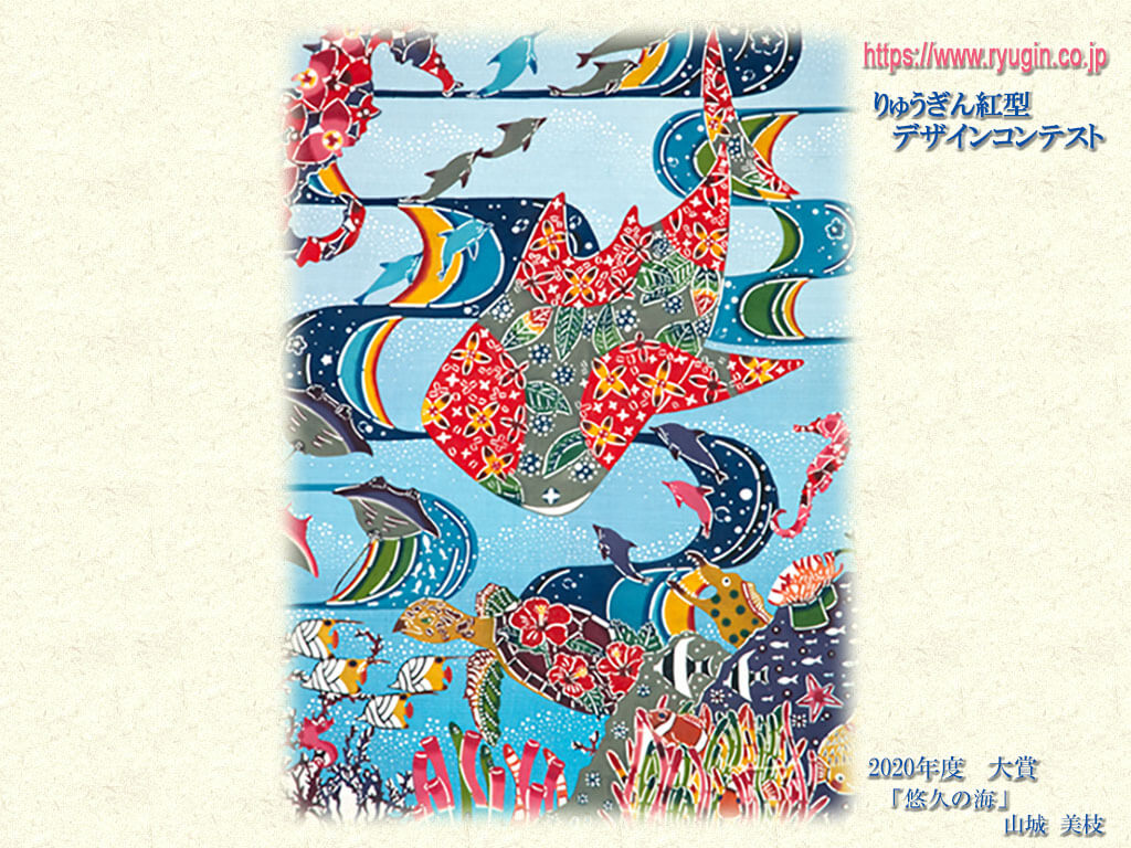 一般枠の今年の大賞には「悠久の海」山城美枝さんの作品。全体を淡いブルーで統一し、古典紅型の流水文様を現代感覚でアレンジした巧みな構成は見事である。中央には色彩豊かなジンベエザメが優優と泳ぎ、画面全体にはサンゴやクマノミ、亀、タツノオトシゴ、マンタ、イルカ等々をリズミカルに配し、彩色も美しくスッキリした作品に仕上げている。