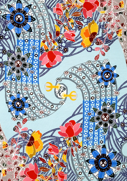 地色を黄色と薄緑色を太陽の光に見立てて、その上にパイナップルとゴーヤーと月桃など沖縄らしい産物を画面に詰め込んである。それらを万華鏡からの展開図にしている。10個ほどの三角形ののぞき穴の図形が一種のリフレインになって強調部になっているのが特徴だ。