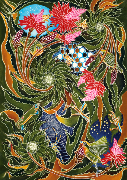 モノレール牧志駅の下の方にアロエの群生が渦巻き状に繁茂しているという。そのアロエの筒状の赤い花には、小鳥(メジロ)や蜂が寄ってくる。また葉の上にはヤモリやカマキリが虫を捕らえようと構えている。画面上の方には蜂の巣、下の方には蜘蛛(くも)の巣。そしてアロエの多肉質の葉が渦状に伸びていて、作者は生物たちの営む空間を見事に活写している。