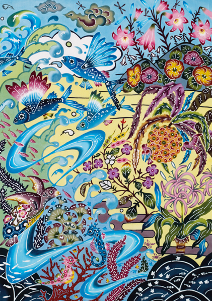 作品名が「間」としてあるのは、海底の海草の間から顔をのぞかせて立っているタツノオトシゴ、力強く泳ぐ海亀、グルクンの群れ、胸びれを広げた飛魚、黄赤色の大きいアダンの実などが海底の生物の空間を如実に捉えている。その上、陸地の植物などと海底の生物と合体させた小宇宙の空間がバランスよく、ダイナミックな表現で成功している(作者は過去にデザイン賞を二回受けている実力者だ)。