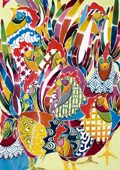 十羽ほどの鶏が寄り添うようにタブローに詰め込まれ、赤・青・白などの濃い色彩のデザイン。おそらく時を告げる雄鶏(おんどり)の観賞用品種と採卵用の雌鶏(めんどり)などを取り混ぜての群鶏であろう。描かれた画面は、造形的に迫力があり、躍動感が漲(みなぎ)っている。