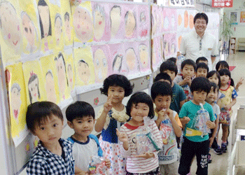 園児のお父さん、お母さん、おじいちゃん、おばあちゃん達が孫の絵を目を細めて見入っている光景や、記念撮影をしている姿もありました。