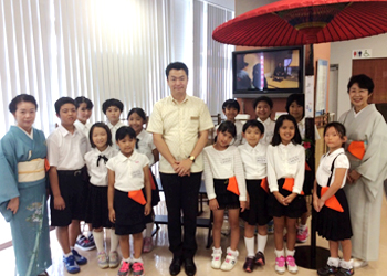 那覇新都心支店では、銘苅・天久小学校の20名ほどの生徒さんが、お客様の目の前でお茶を点てて、おもてなしをしました。