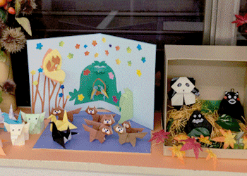 樋川支店のロビーでは、11月2日から27日までの間、池原光子様の折り紙および貼り絵作品を展示させていただきました。