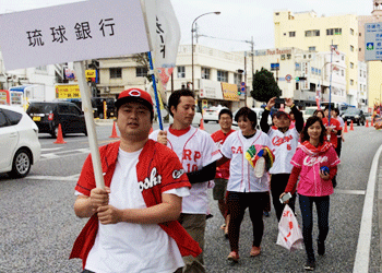 コザ支店と諸見支店は合同で参加し、広島カープのユニフォームでコスプレをしてパフォーマンスをしました。
