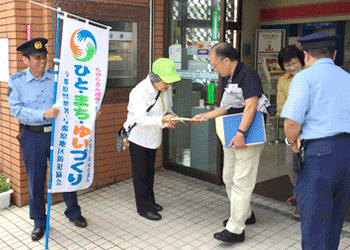 年金支給日に合わせて与那原支店の玄関で、与那原警察署生活安全課、与那原地区防犯協会の方々と一緒に、振り込め詐欺防止のチラシ配布を行いました。