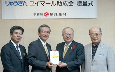 平成27年12月、社会福祉法人 沖縄県共同募金会 会長 湧川 昌秀 様より、「寄付金は障がいのある方への支援をしている県内小規模団体の活動費や児童養護施設の子どもたちの進学・就職に必要な支度金、離島の高齢者や障がい者の方々が明るい正月を迎えるための義援金の支給など、歳末時期に必要とする事業に幅広く活用させていただく」とのお言葉をいただきました。