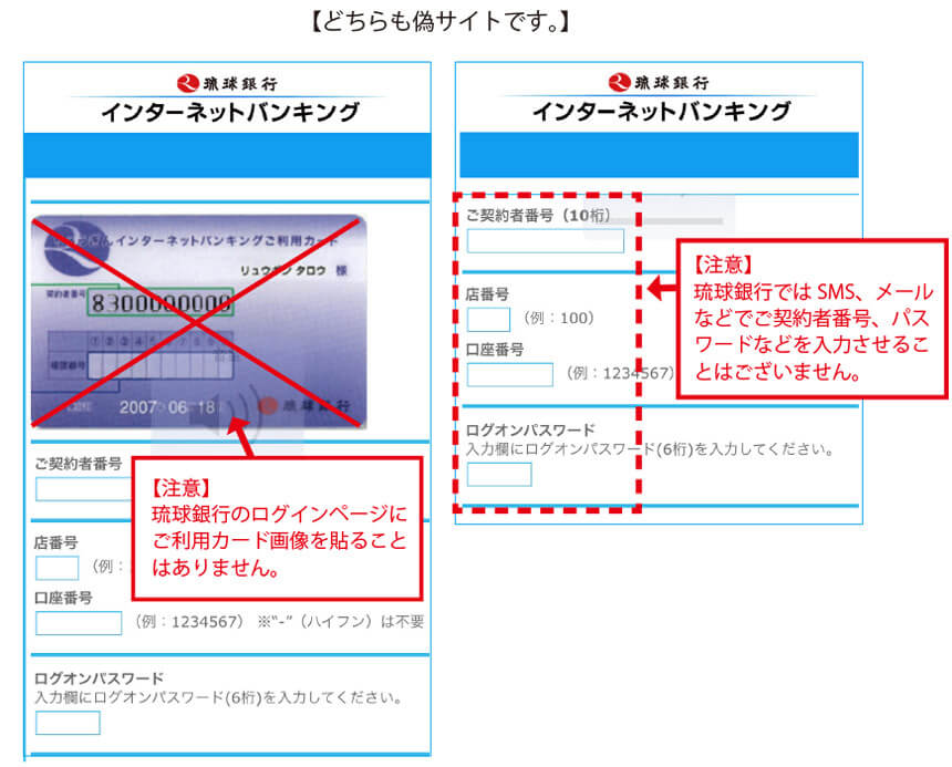 当行ではお客様に対して、SMS、電子メールでインターネットバンキングのID、パスワードを入力させることはありません。