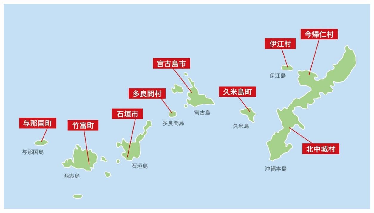 与那国町(2019年7月)、石垣市(2019年8月)、竹富町(2019年8月)、北中城村(2019年9月)、今帰仁村(2019年12月)、久米島町(2020年1月)、伊江村(2020年3月)、宮古島市(2020年7月)、多良間村(2020年7月)