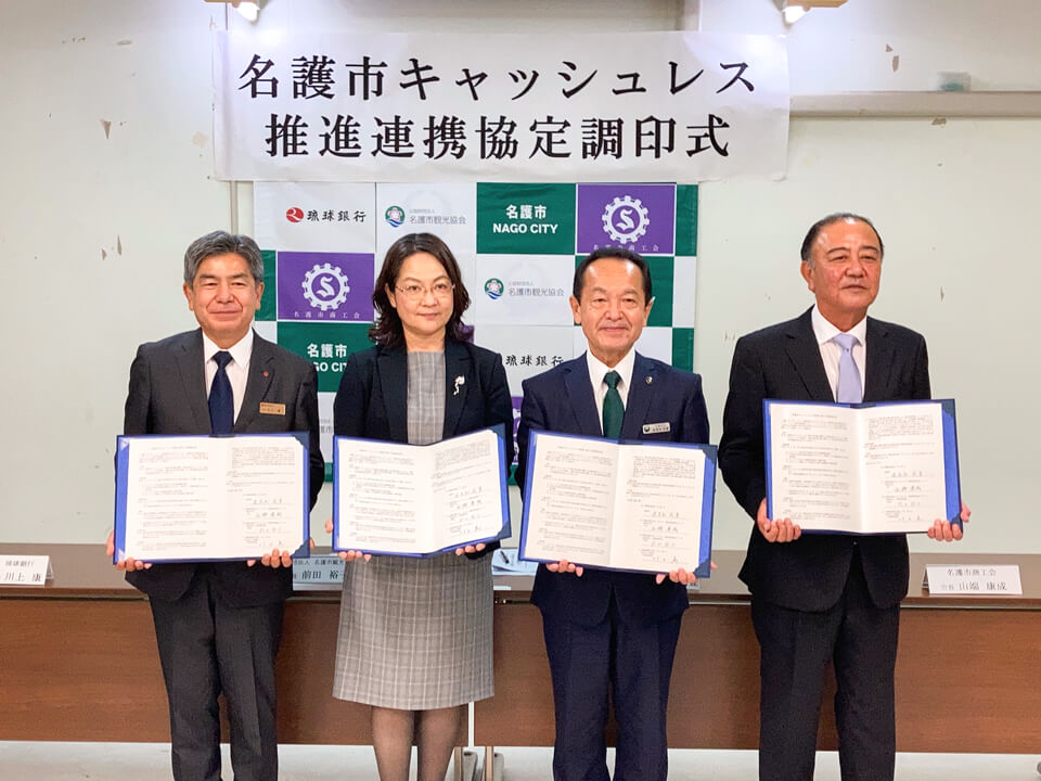 琉球銀行(頭取 川上 康)は、名護市(市長 渡具知 武豊)、名護市商工会(会長 山端 康成)、公益財団法人名護市観光協会(理事長 前田 裕子)との4者間で、「キャッシュレス推進に関する連携協定」を締結したことをお知らせいたします。