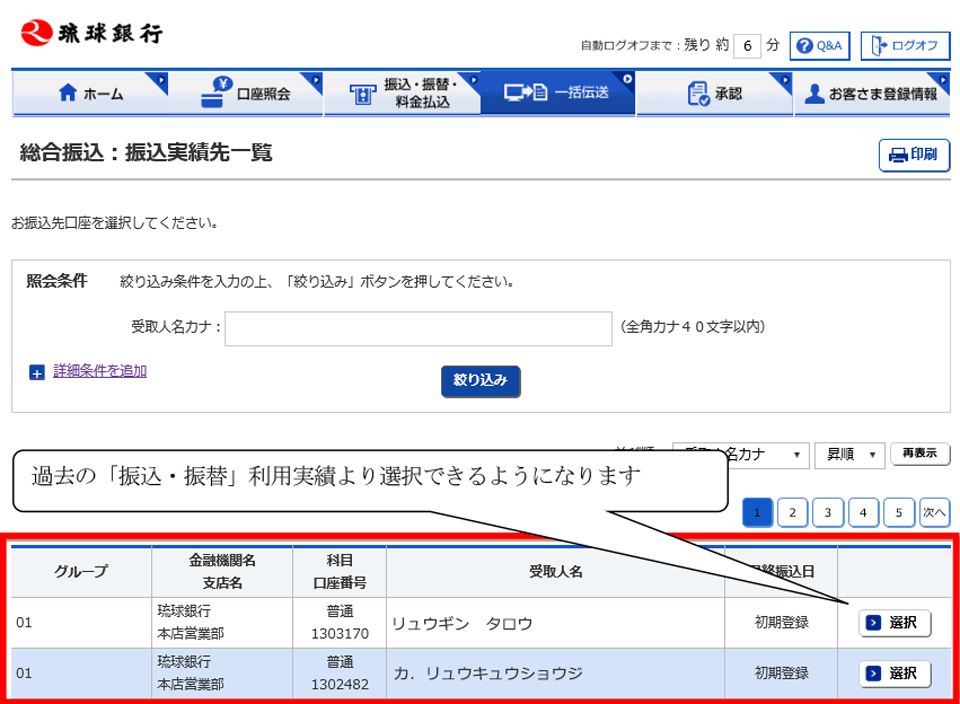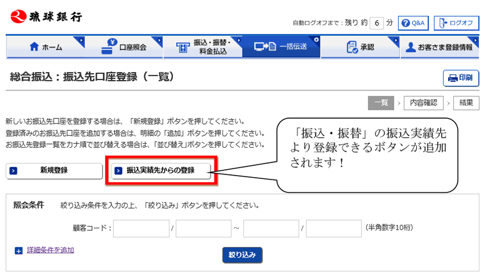 総合振込で、「振込・振替」の利用実績先より振込先登録ができるようになります。