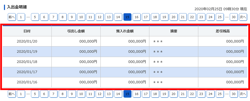 口座照会の入出金明細照会画面