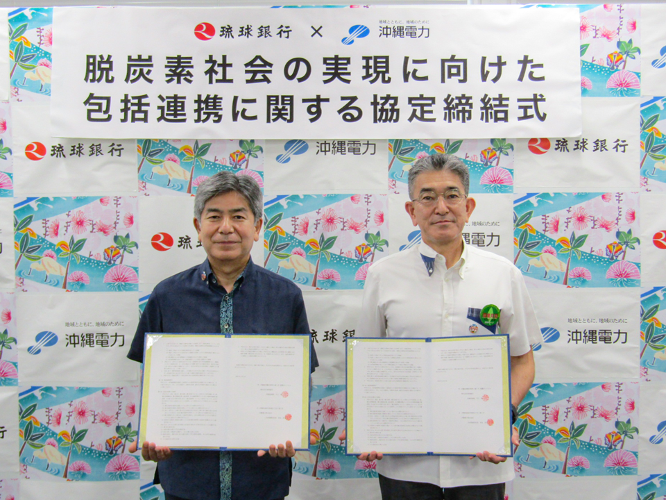 株式会社琉球銀行(取締役頭取:川上康、以下「琉球銀行」)と沖縄電力株式会社(代表取締役社長:本永浩之、以下「沖縄電力」)は、本日、脱炭素社会の実現に向けた包括連携に関する協定を締結いたしました。