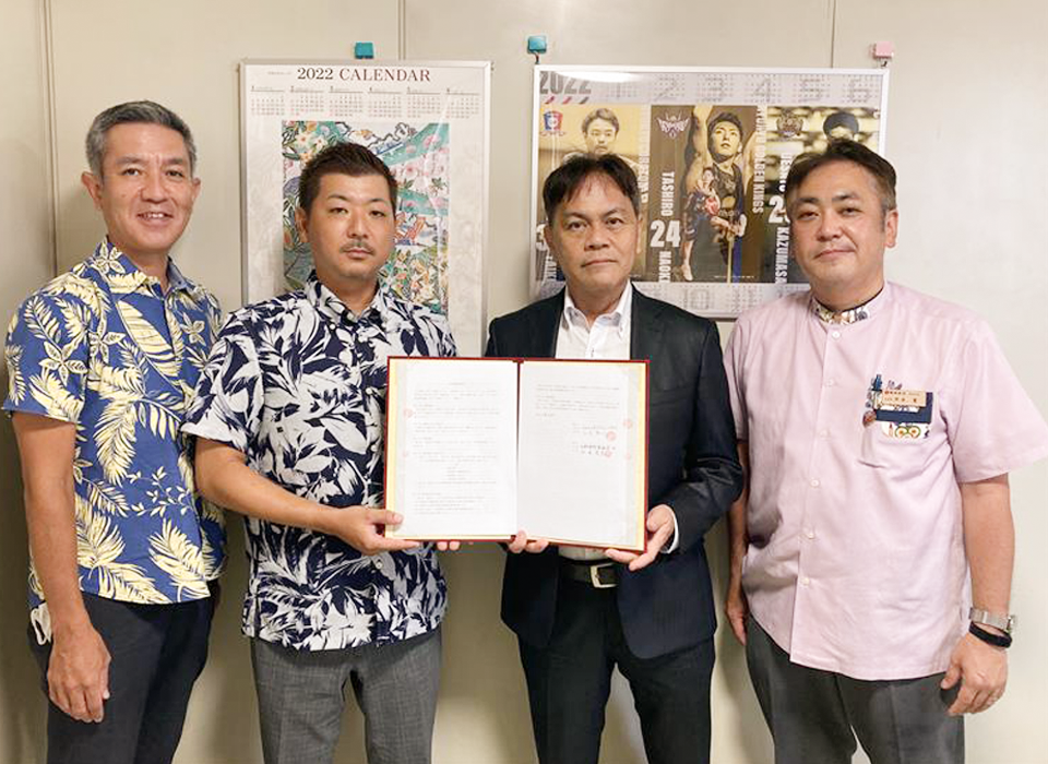 左から豊見城支店 渡久地支店長、㈱エイト産業 山里社長、(有)平田工房 平田社長、坂田支店 仲本支店長