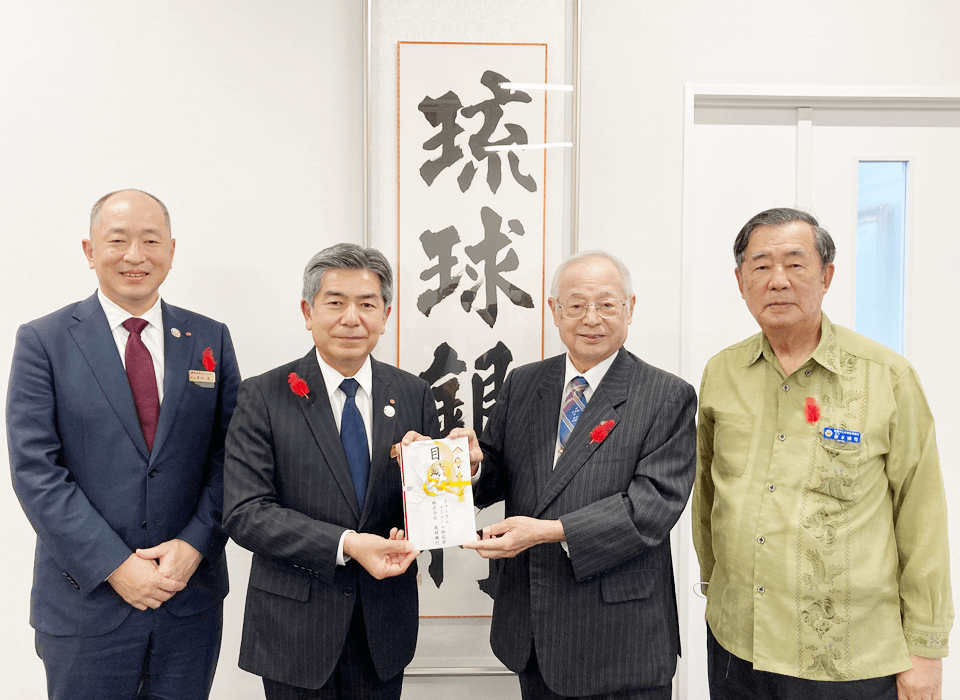 (左から)琉球銀行 菊地総合企画部長、川上頭取、沖縄県共同募金会 湧川会長、那覇市共同募金委員会 新本会長