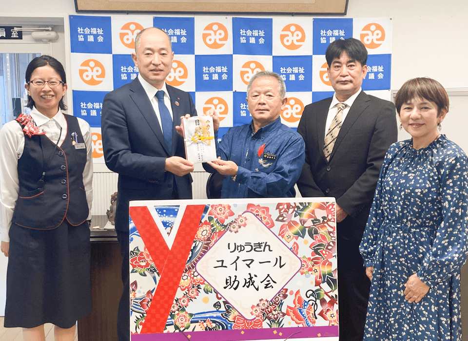 沖縄県社会福祉協議会で行われた贈呈式では、菊地運営委員長より「役職員からの想いも含まれた支援金です。将来に向けてお役立てください。」との言葉とともに目録を贈呈いたしました。
