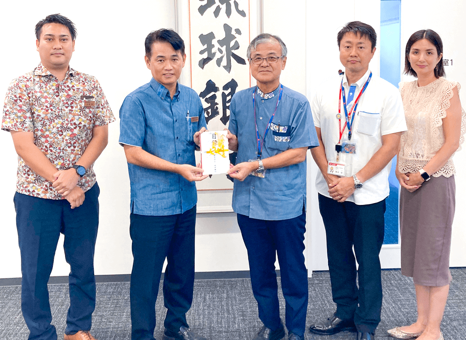 (左から)琉球銀行労働組合 宮里執行委員長、総合企画部 渡名喜部長、
