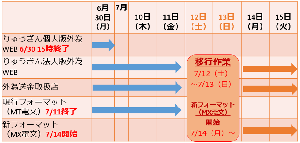 7月11日(金)までは現行フォーマット(MT電文)、7月14日(月)以降は新フォーマット(MX電文)でのお取引になります。