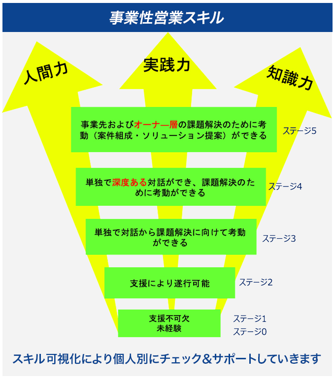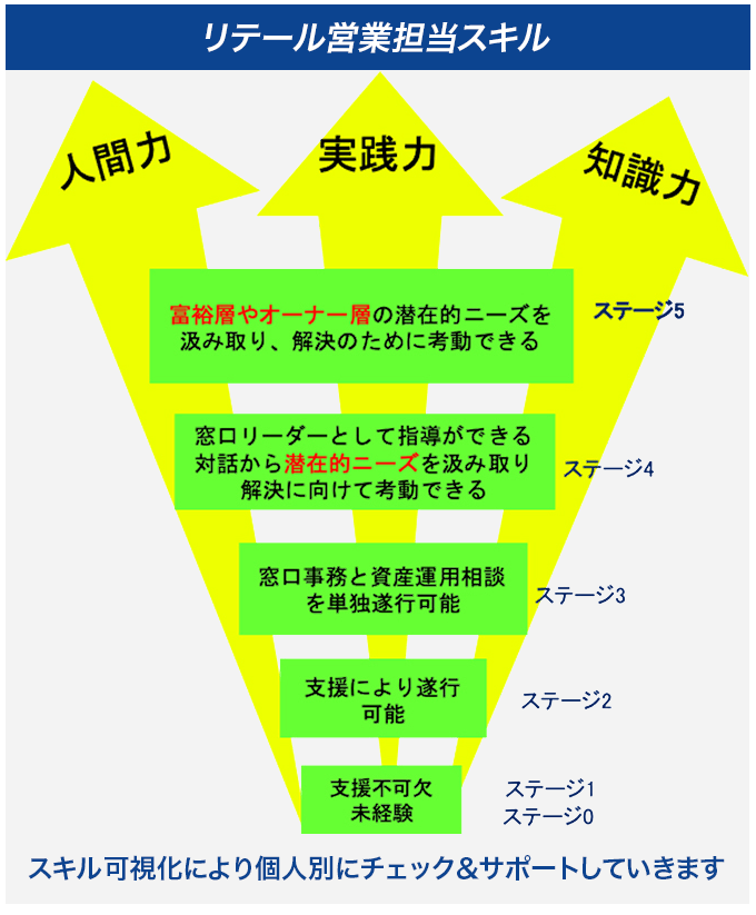 目指す行員像への成長に向けて、ステージごとに人間力(ヒューマンスキル)、知識力(求める知識基準)、実践力の3要素にてスキルアップしていきます。