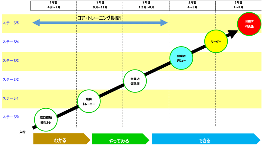 従来の育成プログラムでは、3カ月をトレーニング期間とし、その後はOJTを中心とした育成を行っていました。しかしながら、昨今の銀行を取り巻く環境は、お客様の課題解決に向けて、より高度、広範な業務習得が必要となっており、OJTでなかなか習得できなくなっています。