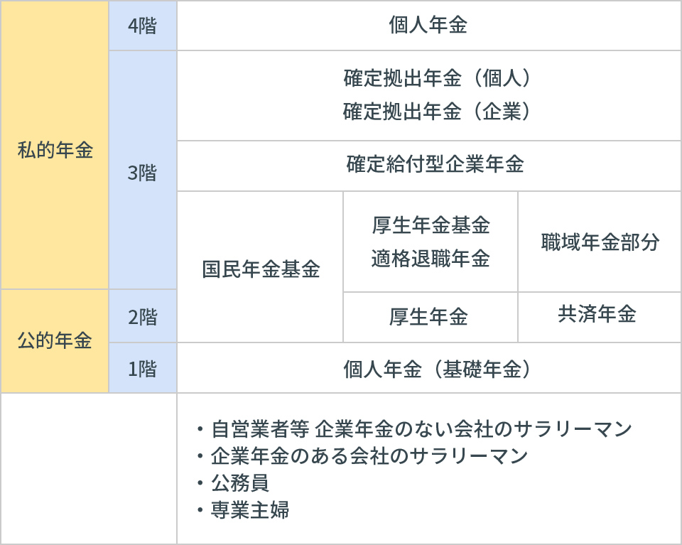 サラリーマンの場合は、国民共通の基礎年金、会社と従業員が折半で積み立てている厚生年金の公的年金に加え、企業が独自に行う年金制度である企業年金(厚生年金基金、適格退職年金、確定拠出年金)があります。