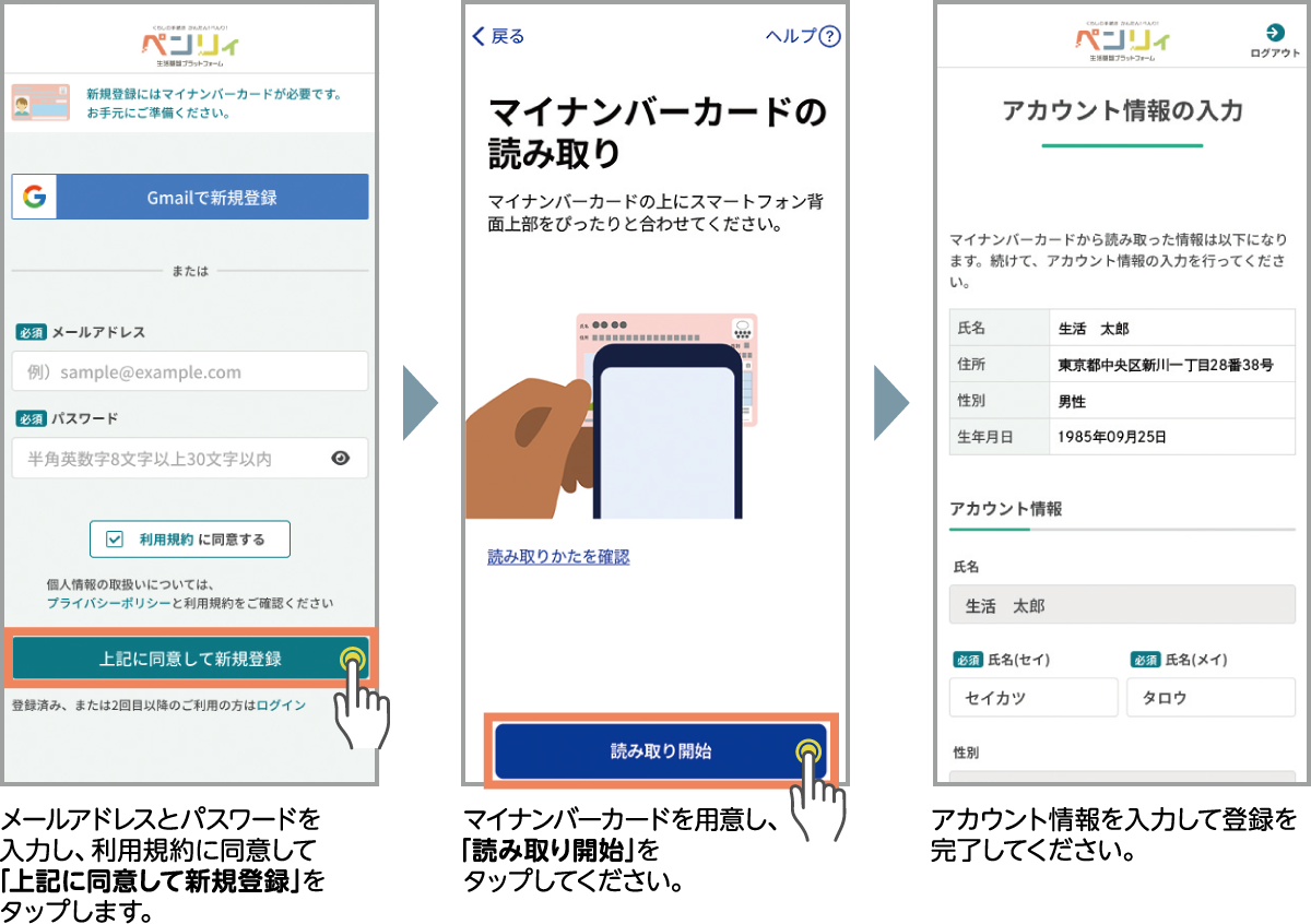 ペンリィなら操作もカンタン!「新規ユーザー登録」を済ませたら、自治体や金融機関のページで手続きを選ぶだけ。すぐに使えてとっても便利です!