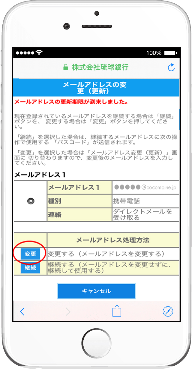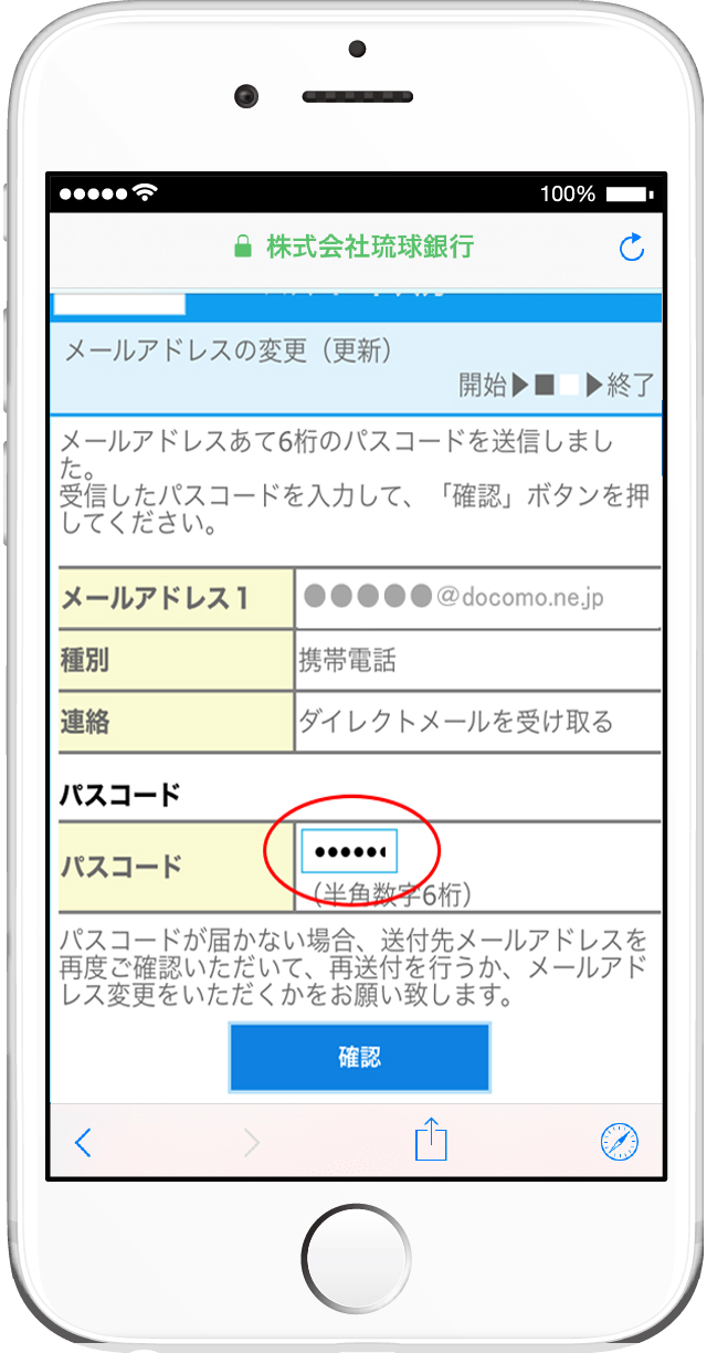- 変更または継続いずれかを選択した場合でも、当該アドレスに「パスコード」を送信し、次画面で入力していただきます。