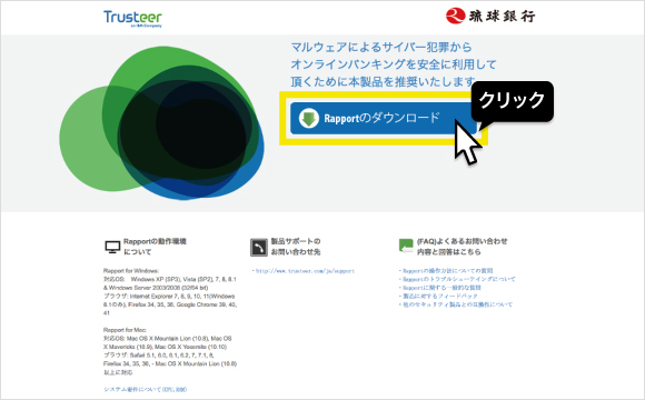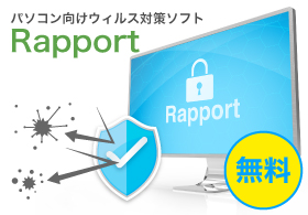 りゅうぎんではお客さまに安心してインターネットバンキングをご利用いただくため、パソコン向けのウィルス対策ソフト「Rapport」を無償で提供しております。このソフトをお使いになっているパソコンに導入していただくことで、インターネットバンキング取引の安全性が格段に向上します。ぜひみなさまのパソコンに導入して、ご利用頂きますようご案内いたします。
