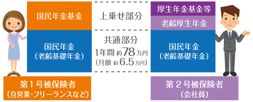 国民年金基金に加入することによって、自営業などの第1号被保険者の方々の公的な年金も、会社員と同じ「2階建て」にすることができます。