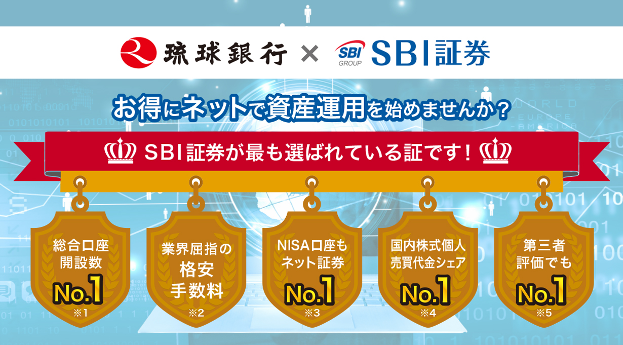 ※琉球銀行が金融商品仲介でご案内する各種商品等やサービスは、SBI証券が提供するものです。 お客さまとSBI証券とのお取引きは、SBI証券のWEBサイト上で行っていただきます。