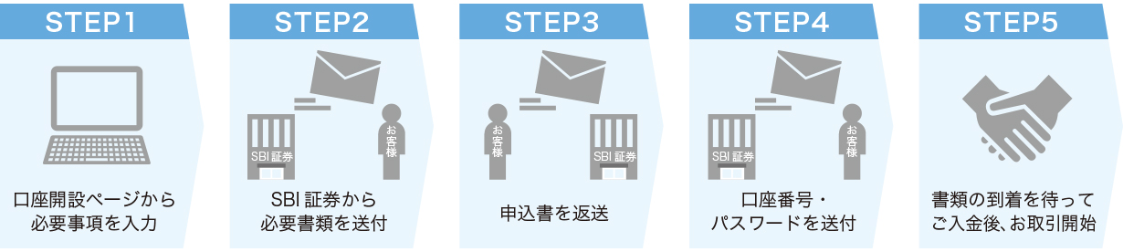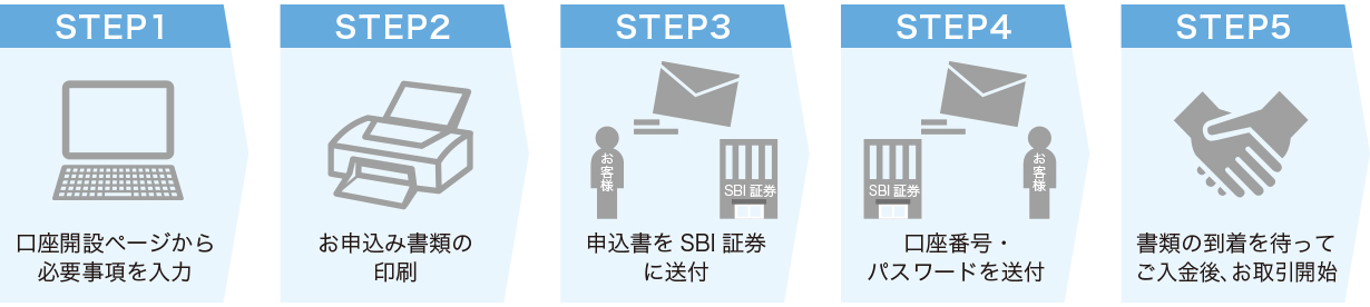 - 当行は、金融商品仲介において、SBI証券の証券口座開設申込みの受付およびSBI証券の取扱う各種金融商品とそのお取引に関するご案内を行います。当行WEBサイトからのお申込み後、SBI証券で所定のお手続きが完了し、お客さまの証券口座が開設されますとお取引を開始することができます。