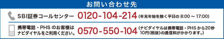 SBI証券コールセンター 0120-104-214(年末年始を除く平日の8:00~17:00)